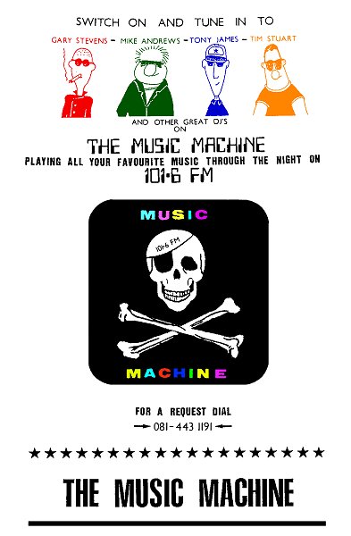 At this time DJs that could be heard on the station included myself, Garry Stevens, as well as Mike Andrews, Steve Roberts, Tony James, Tim Stuart, Mike St John and Ruski (on the radio). The format was a mixture of oldies, eurorock and light rock and pop. The station suffered two minor DTI raids within the first few weeks of commencing transmissions but then was left alone for a period of three and a half months. This was largely due to Eric Gotts refusing to raid the station as he had said that compared to the other stations we were doing no harm. This information came from one of Eric's colleagues, who will remain nameless. Sadly Eric retired and things were about to change for the worse. At least it can be said that Eric came good in his last few months recognising that we were purely anoraks and nothing more. A few weeks later Eric's young and enthusiastic replacement took over, the Music Machine then suffered five raids and as many attempts at returning. It was November and the decision was made to suspend transmissions. DJs then concentrated on running Radio Veronica which then also suffered heavily from DTI raids. Nothing more was heard from the Music Machine and the DJs became involved in various other radio projects.