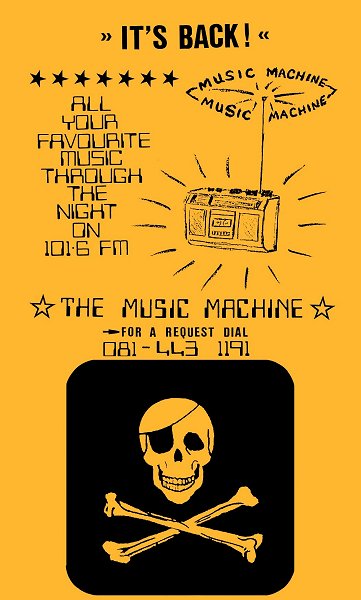 In the Spring of 1990 Radio Veronica was being transmitted on 101.6 FM by myself and the rest of the station's management. The frequency was amicably shared with fellow London station Q-102. The two stations between them broadcast from Friday evening to Sunday night. However during the week the frequency was vacant. Not wanting to lose our frequency to another station the management's proposed to keep a low power transmitter operating on 101.6MHz during the week. At first it was decided for it to just transmit a 1KHz tone, this was soon dropped in favour of a continuous music tape. In May 1990 the Music Machine commenced transmissions. There were no DJs only some jingles between the records including one mentioning "The Music Machine" and this is how the station name came about. After a few weeks a telephone number was given out on air and due to increasing popularity DJs began to be heard on the station.The station was then broadcasting Monday to Thursday 5pm to 9am. Programmes were two hours long and repeated throughout the night. The transmitter power at that time was 20 watts fed into a half wave dipole.