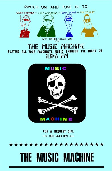 At this time DJs that could be heard on the station included myself, Garry Stevens, as well as Mike Andrews, Steve Roberts, Tony James, Tim Stuart, Mike St John and Ruski (on the radio). The format was a mixture of oldies, eurorock and light rock and pop. The station suffered two minor DTI raids within the first few weeks of commencing transmissions but then was left alone for a period of three and a half months. This was largely due to Eric Gotts refusing to raid the station as he had said that compared to the other stations we were doing no harm. This information came from one of Eric's colleagues, who will remain nameless. Sadly Eric retired and things were about to change for the worse. At least it can be said that Eric came good in his last few months recognising that we were purely anoraks and nothing more. A few weeks later Eric's young and enthusiastic replacement took over, the Music Machine then suffered five raids and as many attempts at returning. It was November and the decision was made to suspend transmissions. DJs then concentrated on running Radio Veronica which then also suffered heavily from DTI raids. Nothing more was heard from the Music Machine and the DJs became involved in various other radio projects.